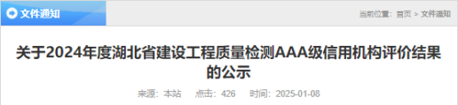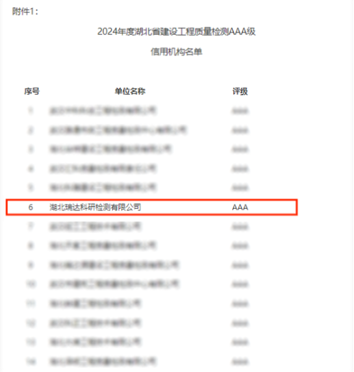近日,湖北省建設工程質(zhì)量安全協(xié)會發(fā)布了2024年度湖北省建設工程質(zhì)量檢測AAA級信用機構評價結果,瑞達科研檢測公司憑借優(yōu)異的誠信建設和信用管理能力,榮獲最高級“AAA級”信用機構評價。